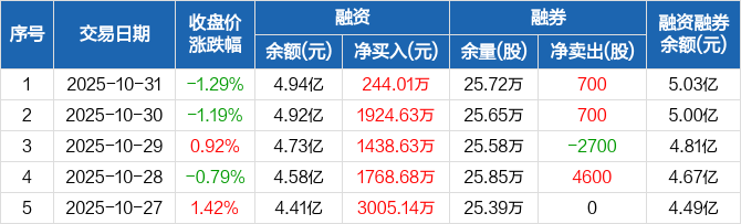 华测导航融资融券信息显示,2025年10月31日融资净买入244.01万元;融资余额4.94亿元,创历史新高,较前一日增加0.5%。