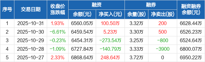 融资方面,当日融资买入593.52万元,融资偿还493.01万元,融资净买入100.5万元。融券方面,融券卖出200股,融券偿还0股,融券余量3.32万股,融券余额68.39万元。融资融券余额合计6628.44万元。