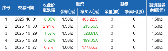 融资方面,当日融资买入1135.2万元,融资偿还671.98万元,融资净买入463.22万元。融券方面,融券卖出0股,融券偿还0股,融券余量0股,融券余额0元。融资融券余额合计1.58亿元。