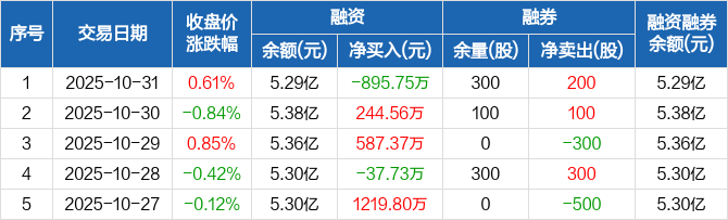 融资方面,当日融资买入1141.02万元,融资偿还2036.77万元,融资净偿还895.75万元。融券方面,融券卖出200股,融券偿还0股,融券余量300股,融券余额4965元。融资融券余额合计5.29亿元。