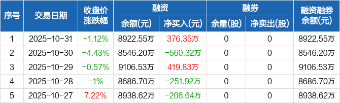 融资方面,当日融资买入1142.67万元,融资偿还766.32万元,融资净买入376.35万元。融券方面,融券卖出0股,融券偿还0股,融券余量0股,融券余额0元。融资融券余额合计8922.55万元。