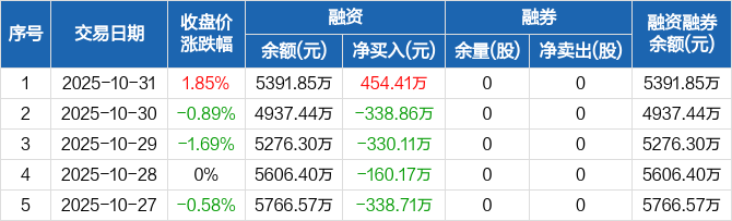 融资方面,当日融资买入657.89万元,融资偿还203.48万元,融资净买入454.41万元。融券方面,融券卖出0股,融券偿还0股,融券余量0股,融券余额0元。融资融券余额合计5391.85万元。