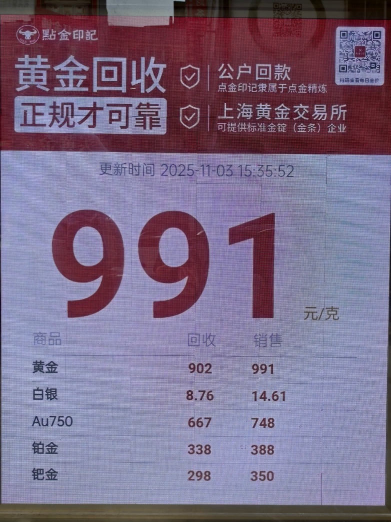 11月3日,每经实地走访了解到,水贝黄金整体加价约7%。“今天我们所有卖的黄金都是每克991元。”另一商家表示。