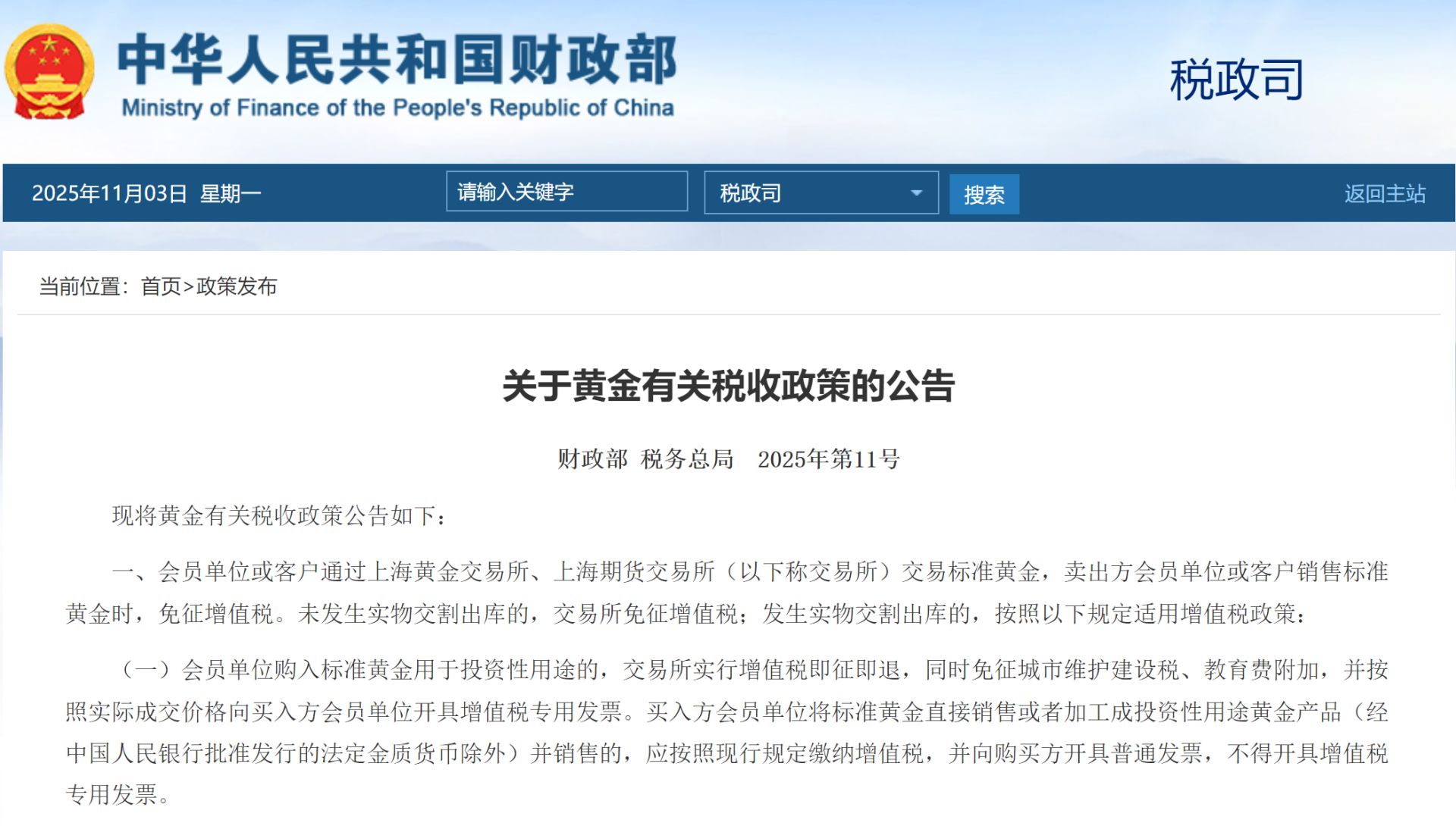 消息面上,11月1日,财政部、国家税务总局发布《关于黄金有关税收政策的公告》,将黄金税收分为投资性黄金和非投资性黄金两类,其中对非投资类的黄金饰品企业,因进项税抵扣减少(由13%降至6%),增值税成本有所提升。