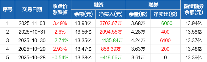 融资方面,当日融资买入7837.32万元,融资偿还4134.64万元,融资净买入3702.67万元。融券方面,融券卖出100股,融券偿还6100股,融券余量3.68万股,融券余额108.16万元。融资融券余额合计13.94亿元。