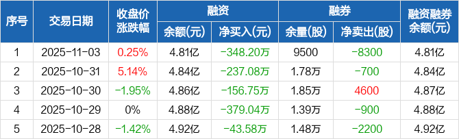 融资方面,当日融资买入483.08万元,融资偿还831.28万元,融资净偿还348.2万元,连续13日净偿还累计4798.91万元。融券方面,融券卖出100股,融券偿还8400股,融券余量9500股,融券余额19.1万元。融资融券余额合计4.81亿元。