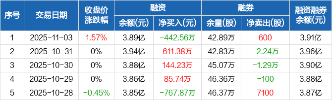 融资方面,当日融资买入2691.44万元,融资偿还3134万元,融资净偿还442.56万元。融券方面,融券卖出1300股,融券偿还700股,融券余量42.89万股,融券余额193.86万元。融资融券余额合计3.91亿元。