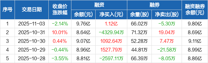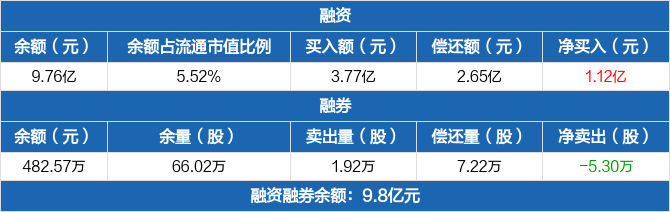 融资方面,当日融资买入3.77亿元,融资偿还2.65亿元,融资净买入1.12亿元。融券方面,融券卖出1.92万股,融券偿还7.22万股,融券余量66.02万股,融券余额482.57万元。融资融券余额合计9.8亿元。