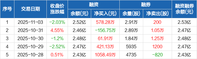 融资方面,当日融资买入887.09万元,融资偿还308.81万元,融资净买入578.28万元。融券方面,融券卖出200股,融券偿还0股,融券余量2.91万股,融券余额78.59万元。融资融券余额合计2.53亿元。
