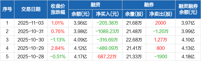 融资方面,当日融资买入2040.78万元,融资偿还2246.15万元,融资净偿还205.38万元,连续4日净偿还累计2100.38万元。融券方面,融券卖出2.17万股,融券偿还1.97万股,融券余量21.68万股,融券余额173.63万元。融资融券余额合计3.97亿元。