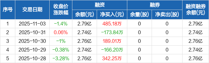 融资方面,当日融资买入1541.21万元,融资偿还1056.03万元,融资净买入485.18万元。融券方面,融券卖出0股,融券偿还0股,融券余量0股,融券余额0元。融资融券余额合计2.79亿元。