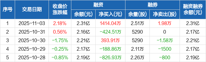 融资方面,当日融资买入4523.45万元,融资偿还3109.41万元,融资净买入1414.04万元。融券方面,融券卖出1.98万股,融券偿还0股,融券余量2.51万股,融券余额82.27万元。融资融券余额合计2.31亿元。