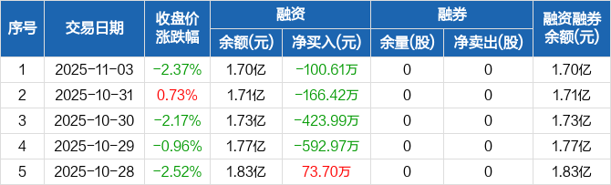 融资方面,当日融资买入619.03万元,融资偿还719.64万元,融资净偿还100.61万元,连续4日净偿还累计1283.99万元。融券方面,融券卖出0股,融券偿还0股,融券余量0股,融券余额0元。融资融券余额合计1.7亿元。