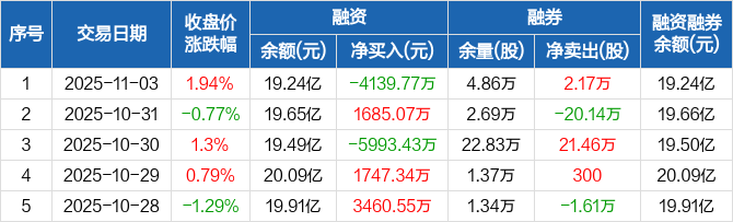 融资方面,当日融资买入5800.82万元,融资偿还9940.6万元,融资净偿还4139.77万元。融券方面,融券卖出3.11万股,融券偿还9400股,融券余量4.86万股,融券余额38.3万元。融资融券余额合计19.24亿元。