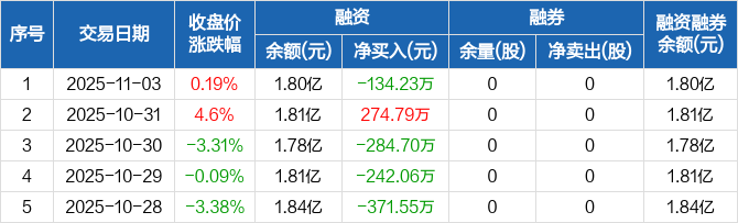 融资方面,当日融资买入311.73万元,融资偿还445.96万元,融资净偿还134.23万元。融券方面,融券卖出0股,融券偿还0股,融券余量0股,融券余额0元。融资融券余额合计1.8亿元。