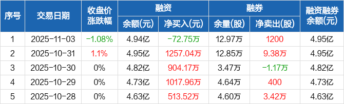 融资方面,当日融资买入2716.82万元,融资偿还2789.57万元,融资净偿还72.75万元。融券方面,融券卖出1600股,融券偿还400股,融券余量12.97万股,融券余额82.88万元。融资融券余额合计4.95亿元。