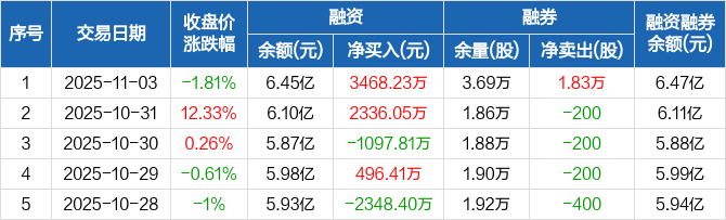 融资方面,当日融资买入9321.51万元,融资偿还5853.28万元,融资净买入3468.23万元。融券方面,融券卖出1.87万股,融券偿还400股,融券余量3.69万股,融券余额172.02万元。融资融券余额合计6.47亿元。