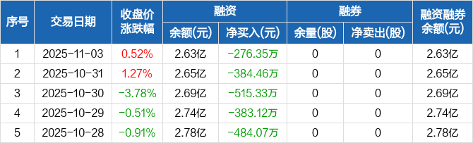融资方面,当日融资买入138.66万元,融资偿还415.01万元,融资净偿还276.35万元,连续5日净偿还累计2043.33万元。融券方面,融券卖出0股,融券偿还0股,融券余量0股,融券余额0元。融资融券余额合计2.63亿元。
