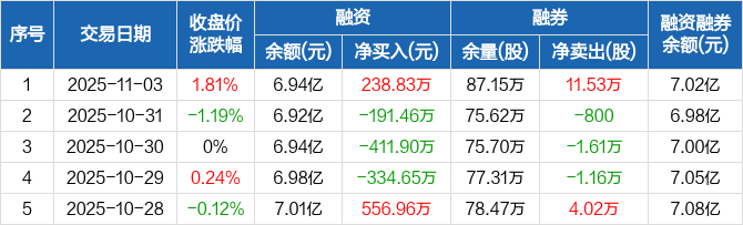 航天信息融资融券信息显示,2025年11月3日融资净买入238.83万元;融资余额6.94亿元,较前一日增加0.35%