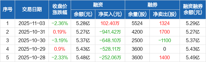 融资方面,当日融资买入3018.17万元,融资偿还2915.78万元,融资净买入102.4万元。融券方面,融券卖出1324股,融券偿还0股,融券余量5524股,融券余额34.57万元。融资融券余额合计5.29亿元。