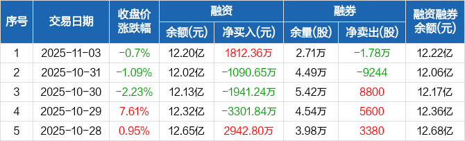 融资方面,当日融资买入6833.27万元,融资偿还5020.92万元,融资净买入1812.36万元。融券方面,融券卖出5200股,融券偿还2.3万股,融券余量2.71万股,融券余额203.5万元。融资融券余额合计12.22亿元。