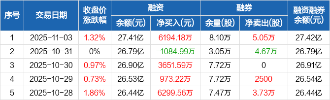 融资方面,当日融资买入1.36亿元,融资偿还7446.52万元,融资净买入6194.18万元。融券方面,融券卖出5.06万股,融券偿还100股,融券余量8.1万股,融券余额68.53万元。融资融券余额合计27.42亿元。