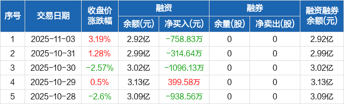 融资方面,当日融资买入3234.35万元,融资偿还3993.18万元,融资净偿还758.83万元,连续3日净偿还累计2169.6万元。融券方面,融券卖出0股,融券偿还0股,融券余量0股,融券余额0元。融资融券余额合计2.92亿元。