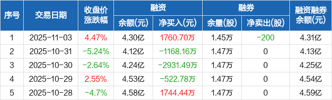 融资方面,当日融资买入4414万元,融资偿还2653.3万元,融资净买入1760.7万元。融券方面,融券卖出0股,融券偿还200股,融券余量1.45万股,融券余额119.32万元。融资融券余额合计4.31亿元。