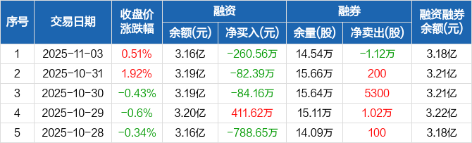 融资方面,当日融资买入565.21万元,融资偿还825.78万元,融资净偿还260.56万元,连续3日净偿还累计427.11万元。融券方面,融券卖出200股,融券偿还1.14万股,融券余量14.54万股,融券余额170.99万元。融资融券余额合计3.18亿元。
