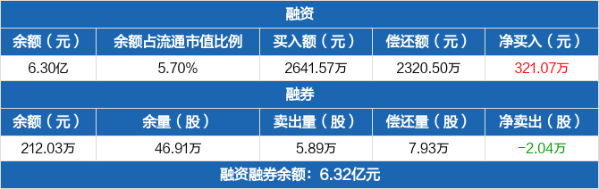 融资方面,当日融资买入2641.57万元,融资偿还2320.5万元,融资净买入321.07万元。融券方面,融券卖出5.89万股,融券偿还7.93万股,融券余量46.91万股,融券余额212.03万元。融资融券余额合计6.32亿元。