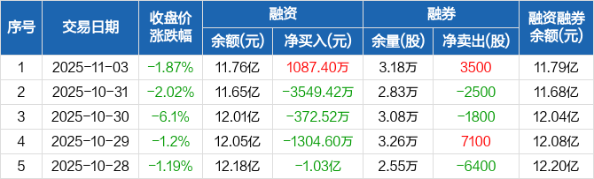 融资方面,当日融资买入6205.58万元,融资偿还5118.17万元,融资净买入1087.4万元。融券方面,融券卖出3500股,融券偿还0股,融券余量3.18万股,融券余额312.91万元。融资融券余额合计11.79亿元。