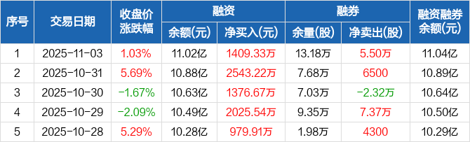融资方面,当日融资买入3253.14万元,融资偿还1843.81万元,融资净买入1409.33万元,连续11日净买入累计1.05亿元。融券方面,融券卖出5.51万股,融券偿还100股,融券余量13.18万股,融券余额207.72万元。融资融券余额合计11.04亿元。