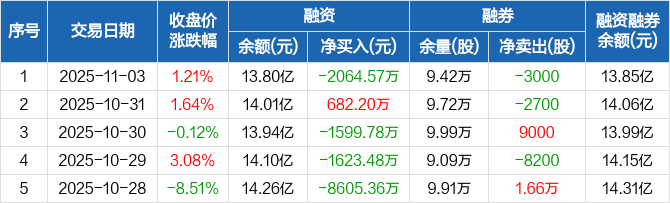融资方面,当日融资买入1.35亿元,融资偿还1.55亿元,融资净偿还2064.57万元。融券方面,融券卖出5100股,融券偿还8100股,融券余量9.42万股,融券余额479.57万元。融资融券余额合计13.85亿元。