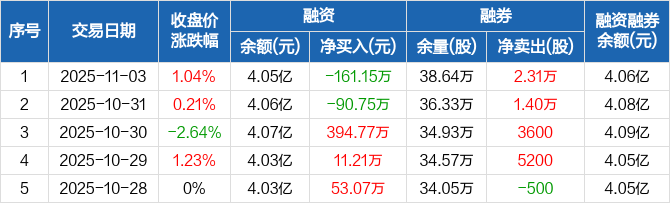 融资方面,当日融资买入691.45万元,融资偿还852.61万元,融资净偿还161.15万元。融券方面,融券卖出2.33万股,融券偿还200股,融券余量38.64万股,融券余额187.79万元。融资融券余额合计4.06亿元。
