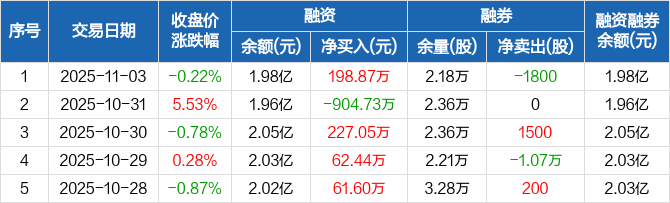 融资方面,当日融资买入1161.66万元,融资偿还962.79万元,融资净买入198.87万元。融券方面,融券卖出400股,融券偿还2200股,融券余量2.18万股,融券余额49.38万元。融资融券余额合计1.98亿元。