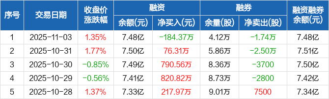 融资方面,当日融资买入2591.72万元,融资偿还2776.08万元,融资净偿还184.37万元。融券方面,融券卖出2200股,融券偿还1.96万股,融券余量4.12万股,融券余额74.45万元。融资融券余额合计7.48亿元。
