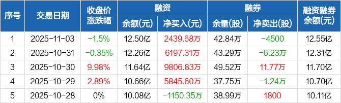 融资方面,当日融资买入1.96亿元,融资偿还1.72亿元,融资净买入2439.68万元,连续4日净买入累计2.43亿元。融券方面,融券卖出6800股,融券偿还1.13万股,融券余量42.84万股,融券余额477.24万元。融资融券余额合计12.55亿元。