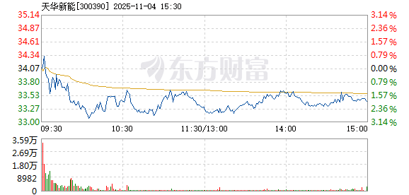 天华新能盘中快速回调,5分钟内跌幅超过2%,截至9点36分,报33.53元,成交3.90亿元,换手率1.71%。