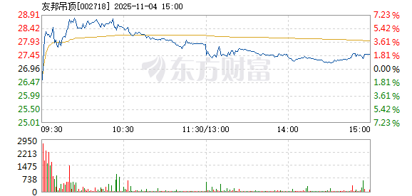 友邦吊顶盘中快速上涨,5分钟内涨幅超过2%,截至9点49分,报28.7元,成交6220.47万元,换手率3.93%。