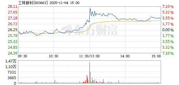 以下是三祥新材在北京时间11月4日13:00分盘口异动快照:11月4日,