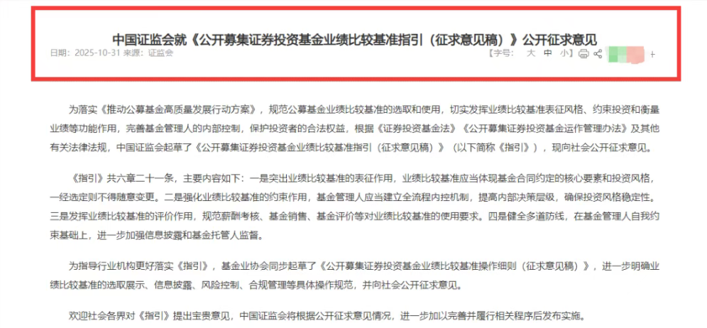 10月31日,中国证监会发布了《公开募集证券投资基金业绩比较基准指引(征求意见稿)》,此次《指引》中明确提出,应突出基准对产品的表征作用,业绩比较基准应充分体现产品定位和投资风格,基准一经选定不得随意变化,不得仅因基金经理变化、市场短期变动、业绩考核或者排名而变更基准。