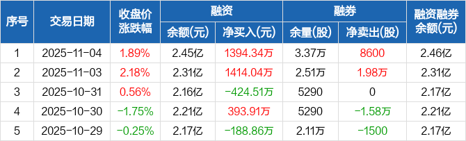 融资方面,当日融资买入4895.95万元,融资偿还3501.6万元,融资净买入1394.34万元。融券方面,融券卖出8600股,融券偿还0股,融券余量3.37万股,融券余额112.56万元。融资融券余额合计2.46亿元。
