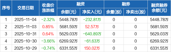 恒宇信通融资融券信息显示,2025年11月4日融资净偿还232.81万元;融资余额5448.78万元,较前一日下降4.1%。