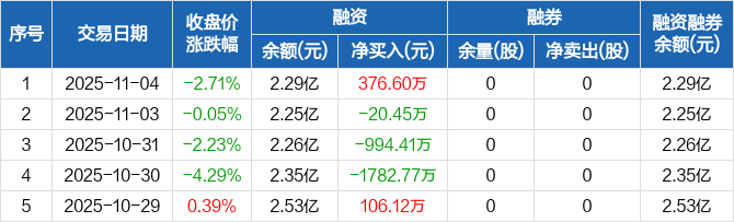 融资方面,当日融资买入2112.59万元,融资偿还1735.99万元,融资净买入376.6万元。融券方面,融券卖出0股,融券偿还0股,融券余量0股,融券余额0元。融资融券余额合计2.29亿元。