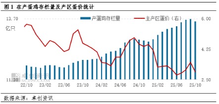 另外,10月份新开产的蛋鸡多为6月份前后补栏的鸡苗,此阶段养殖环节盈利状况不佳且育雏难度较大,补栏心态普遍降低,当月鸡苗补栏量下降至8100万只左右,环比减幅9.40%,因此10月新开产蛋鸡数量减少。淘汰产能增加而新增产能减少的影响下,10月份在产蛋鸡存栏量呈现跌势。