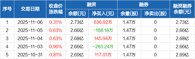 融资方面,当日融资买入1169.35万元,融资偿还532.43万元,融资净买入636.92万元。融券方面,融券卖出0股,融券偿还0股,融券余量1.47万股,融券余额9.42万元。融资融券余额合计2.73亿元。