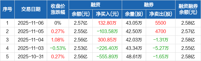 融资方面,当日融资买入538.34万元,融资偿还405.54万元,融资净买入132.8万元。融券方面,融券卖出8200股,融券偿还2700股,融券余量43.05万股,融券余额162.3万元。融资融券余额合计2.58亿元。
