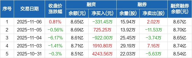 融资方面,当日融资买入5051.7万元,融资偿还5383.15万元,融资净偿还331.45万元。融券方面,融券卖出3.08万股,融券偿还1.06万股,融券余量15.94万股,融券余额199.41万元。融资融券余额合计8.67亿元。
