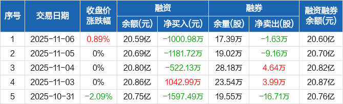 融资方面,当日融资买入8594.71万元,融资偿还9595.69万元,融资净偿还1000.98万元,连续3日净偿还累计2704.82万元。融券方面,融券卖出3500股,融券偿还1.98万股,融券余量17.39万股,融券余额98.6万元。融资融券余额合计20.6亿元。
