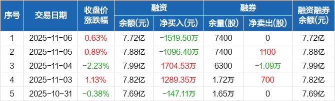 融资方面,当日融资买入750.14万元,融资偿还2269.64万元,融资净偿还1519.5万元。融券方面,融券卖出0股,融券偿还0股,融券余量7400股,融券余额5.92万元。融资融券余额合计7.72亿元。